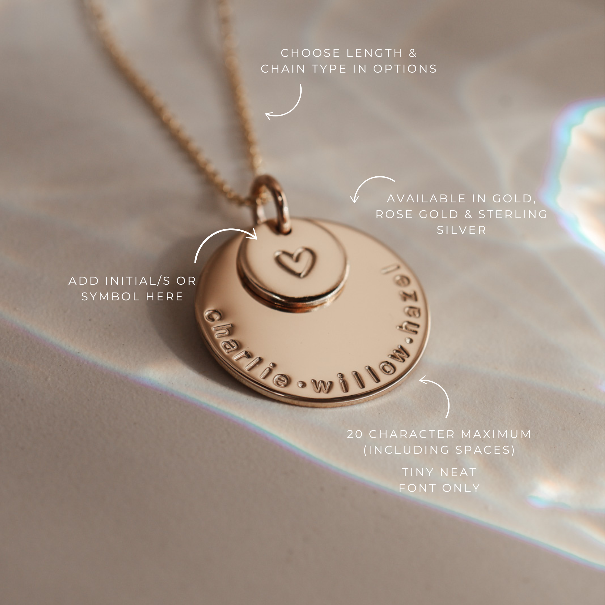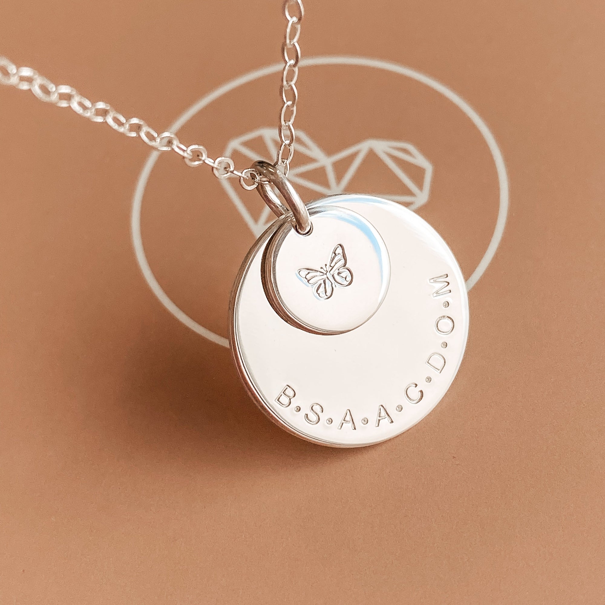 The big sister of our long-time favourite, Soren, the Saffron pendant combines the beauty of the stacked Soren with all the space of our beloved Charlotte. This leaves plenty of space for loved ones' names, birthdates or special text. Personalise with your text curved around the edge of the large pendant and an initial or symbol in the centre of the small pendant.