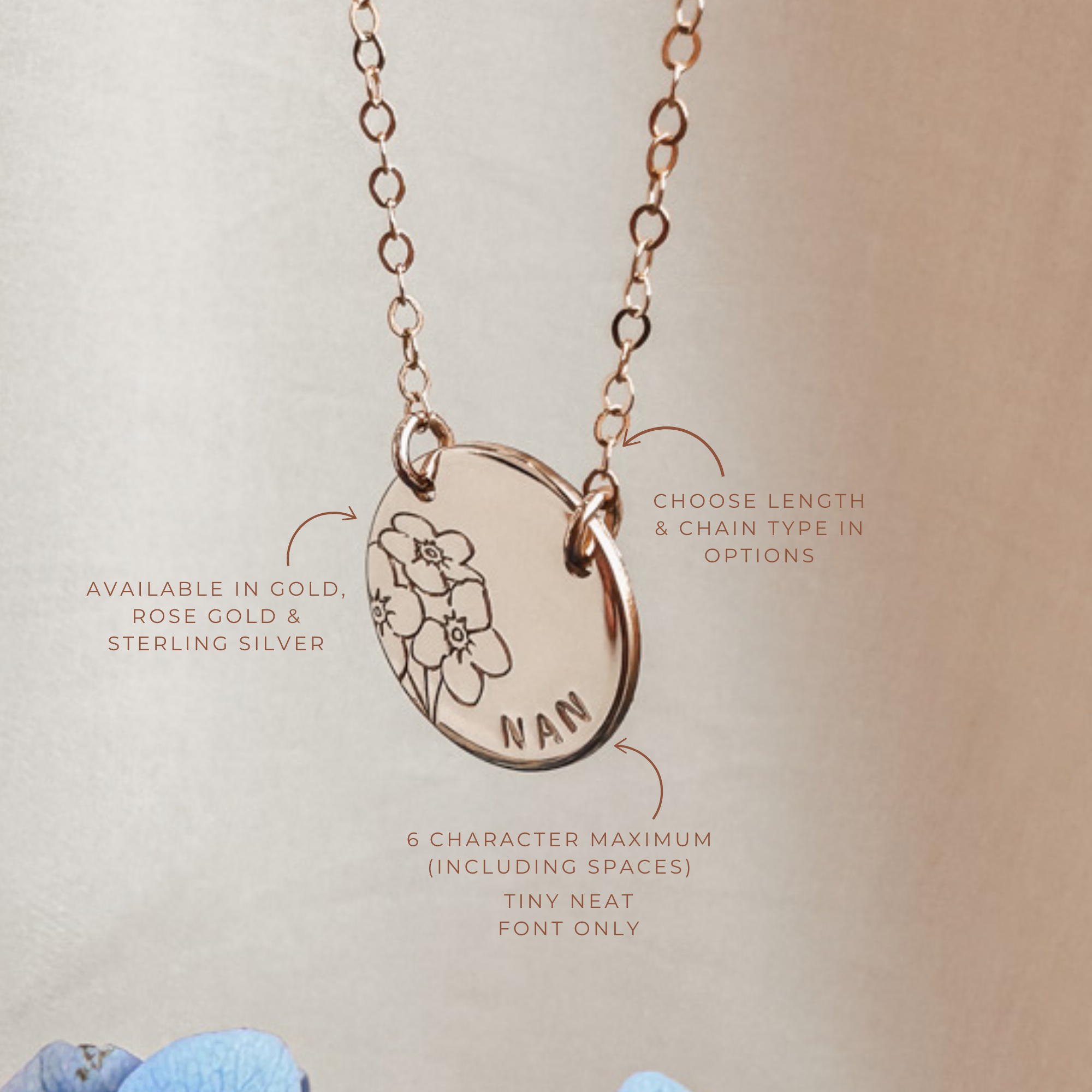 Honour your loved one with our Forget Me Not pendant necklace. These beautiful hand drawn flowers serve as a symbol of enduring love. You can also personalise this piece with up to 7 characters for a more meaningful, comforting reminder of cherished memories.
