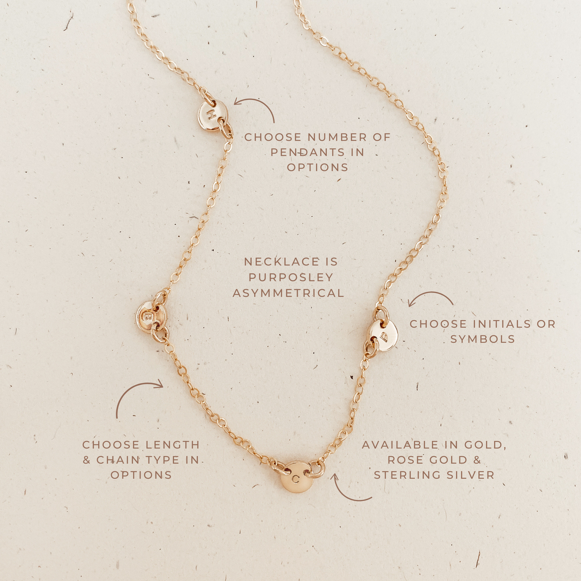 Our Kirby is an all time fave and a KBN classic. Made asymmetrically, she can have up to four pendants, and looks best worn on the collar bone. Perfect for your favourite symbols and loved ones' initials.